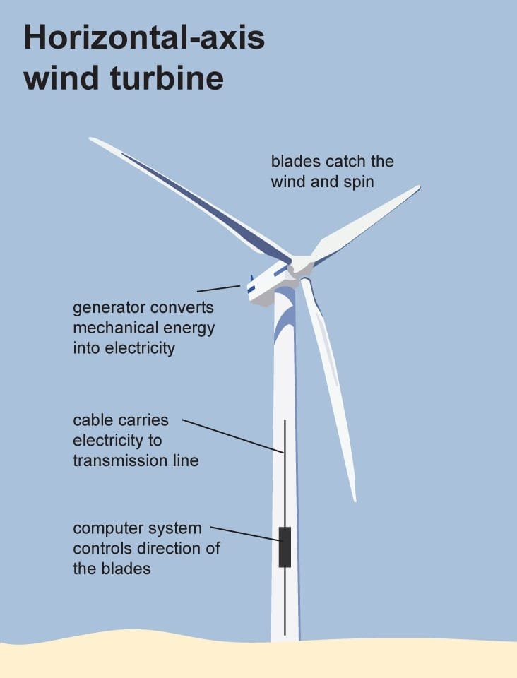 The three blades of a horizontal-axis wind turbine like those on an airplane propeller. The greatest horizontal-axis wind turbines have blades longer than 100 feet and rise as high as 20-story buildings. Longer blades on taller wind turbines generate more electricity.